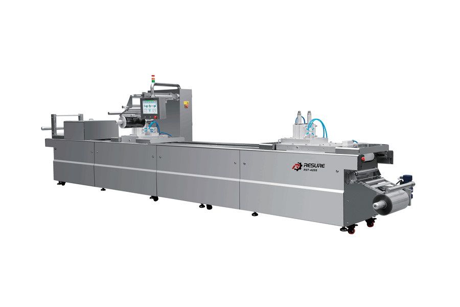 Машина термоформирования RST-425S отличается высокой эффективностью, гибкостью и точностью, что делает её подходящей для различных типов пластиковых материалов. Она состоит из основного корпуса, формовочных и предварительных нагревательных матриц, механизма подачи нижней и верхней пленки, системы запайки для упаковки в модифицированной атмосфере (MAP), системы цепного конвейера, системы резки, системы переработки отходов пленки, пневматической системы, системы охлаждения и системы управления.